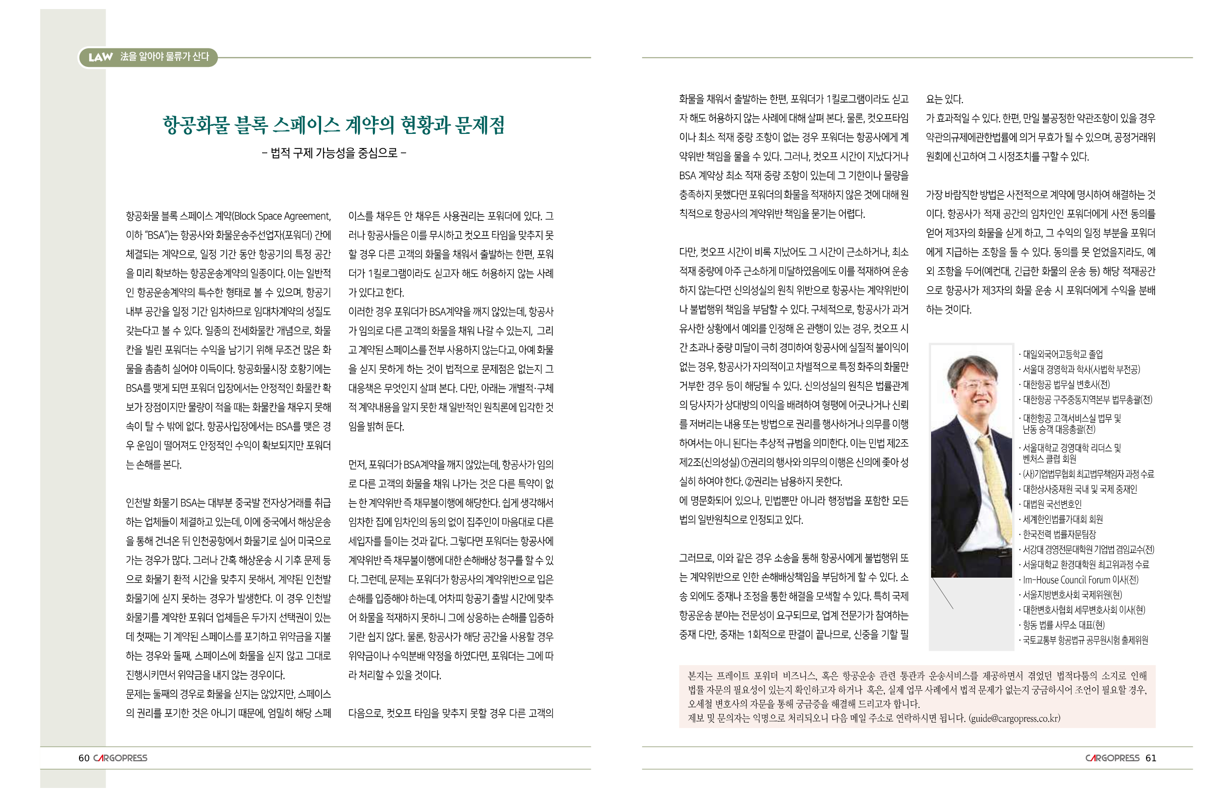 항공화물 블록 스페이스 계약(Block Space Agreement, 이하 “BSA”)는 항공사와 화물운송주선업자(포워더) 간에 체결되는 계약으로, 일정 기간 동안 항공기의 특정 공간 을 미리 확보하는 항공운송계약의 일종이다. 이는 일반적인 항공운송계약의 특수한 형태로 볼 수 있으며, 항공기 내부 공간을 일정 기간 임차하므로 임대차계약의 성질도 갖는다고 볼 수 있다. 일종의 전세화물칸 개념으로, 화물 칸을 빌린 포워더는 수익을 남기기 위해 무조건 많은 화 물을 촘촘히 실어야 이득이다. 항공화물시장 호황기에는 BSA를 맺게 되면 포워더 입장에서는 안정적인 화물칸 확 보가 장점이지만 물량이 적을 때는 화물칸을 채우지 못해 속이 탈 수 밖에 없다. 항공사입장에서는 BSA를 맺은 경 우 운임이 떨어져도 안정적인 수익이 확보되지만 포워더는 손해를 본다.