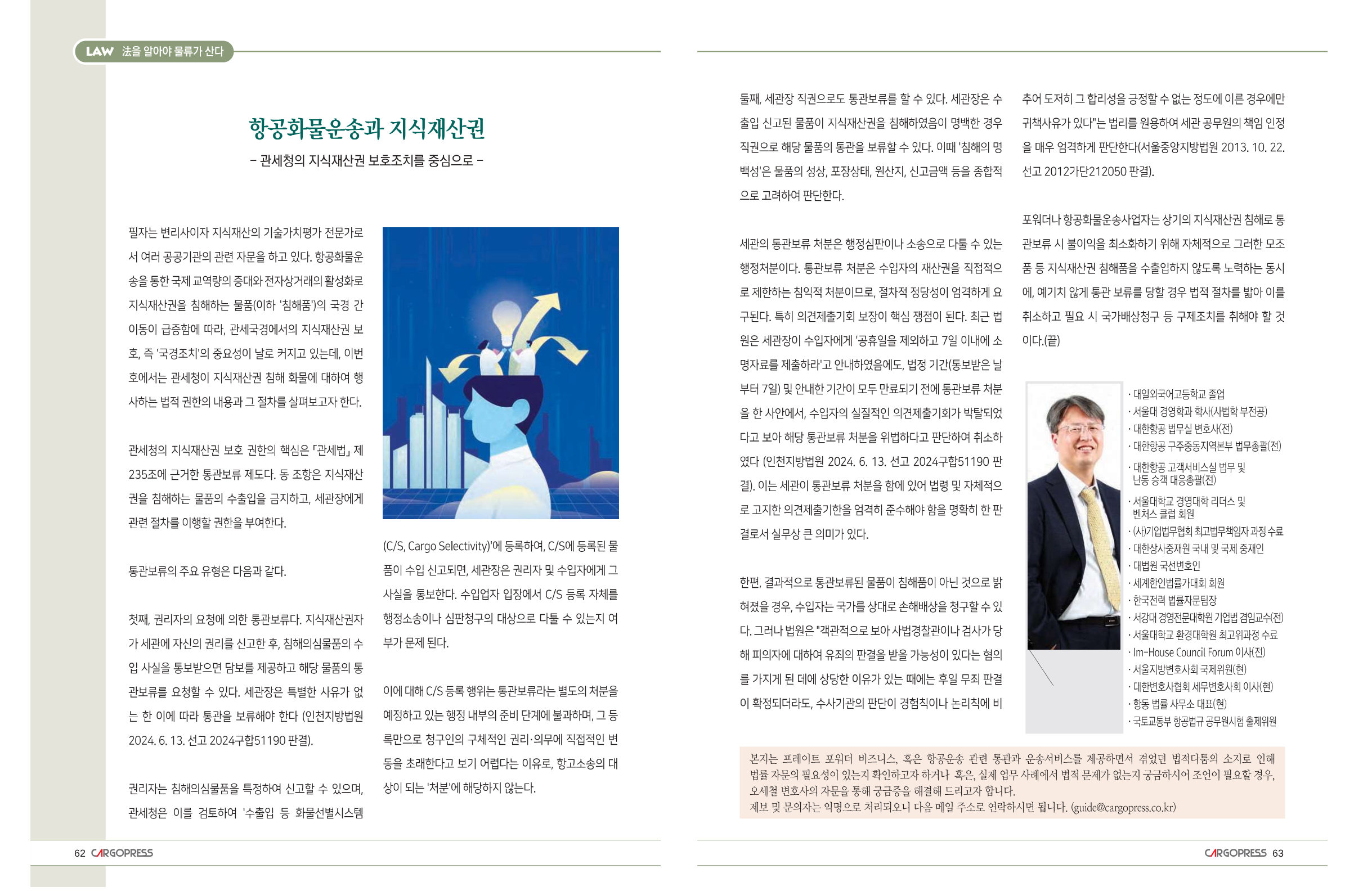 필자는 변리사이자 지식재산의 기술가치평가 전문가로서 여러 공공기관의 관련 자문을 하고 있다. 항공화물운송을 통한 국제 교역량의 증대와 전자상거래의 활성화로 지식재산권을 침해하는 물품(이하 '침해품')의 국경 간 이동이 급증함에 따라, 관세국경에서의 지식재산권 보호, 즉 '국경조치'의 중요성이 날로 커지고 있는데, 이번 호에서는 관세청이 지식재산권 침해 화물에 대하여 행사하는 법적 권한의 내용과 그 절차를 살펴보고자 한다.