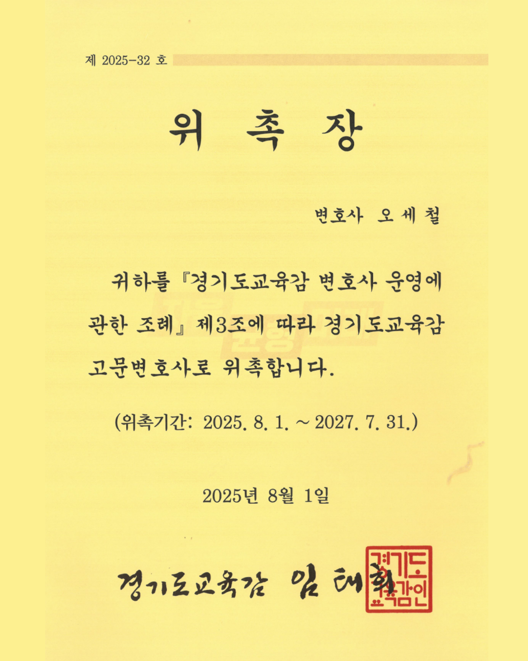 향동법률사무소의 대표변호사 오세철 변호사님은 경기도 교육감 고문변호사로 위촉되어,